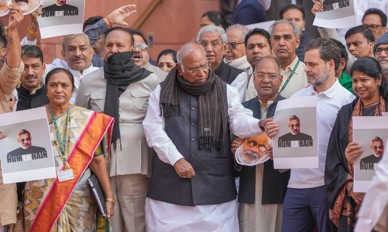 Leader of Opposition in the Lok Sabha Rahul Gandhi and Congress president Mallikarjun Kharge along with MPs of other opposition parties stood outside the Makar Dwar of Parliament and raised slogans of "Modi, Adani ek hain" and "we want justice".