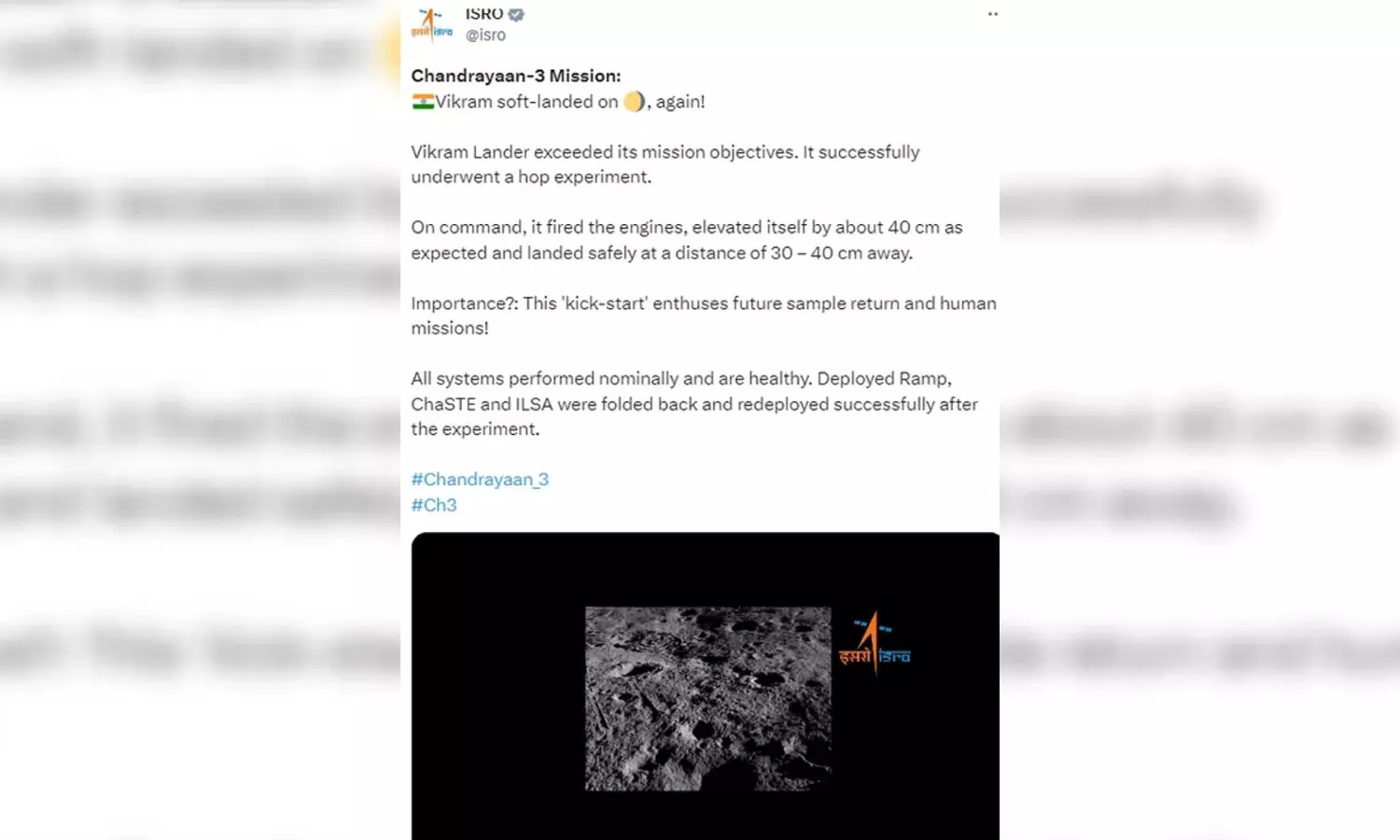 In a post on X, ISRO said: “Vikram Lander exceeded its mission objectives. It successfully underwent a hop experiment.” “On command, it fired the engines, elevated itself by about 40 cm as expected and landed safely at a distance of 30 – 40 cm away.”