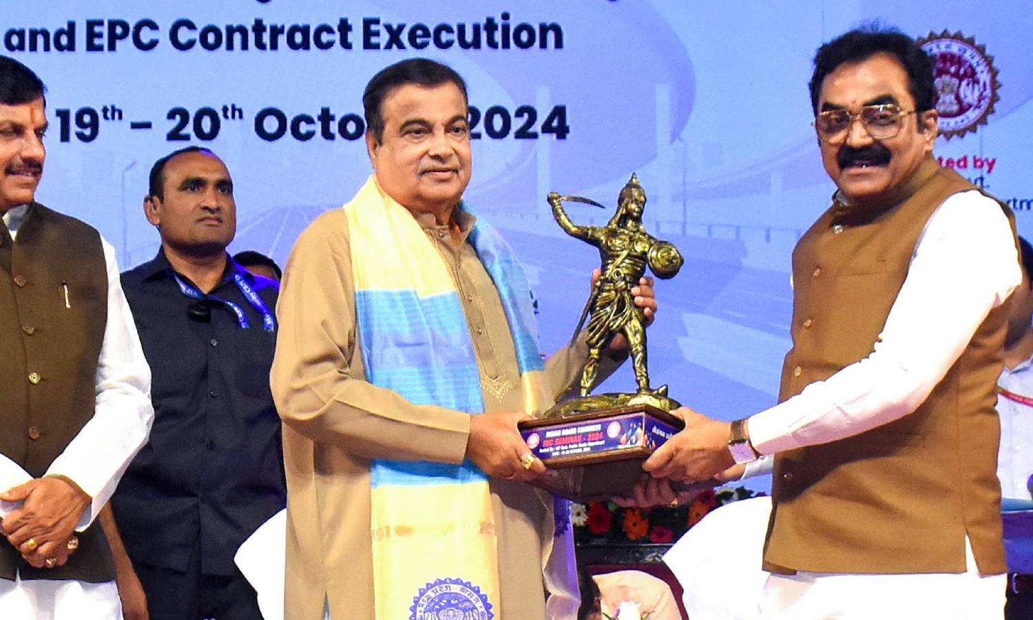 Union Minister Nitin Gadkari being felicitated by Madhya Pradesh Minister Rakesh Singh during the Indian Roads Congress (IRC) Seminar 2024, in Bhopal (PTI)