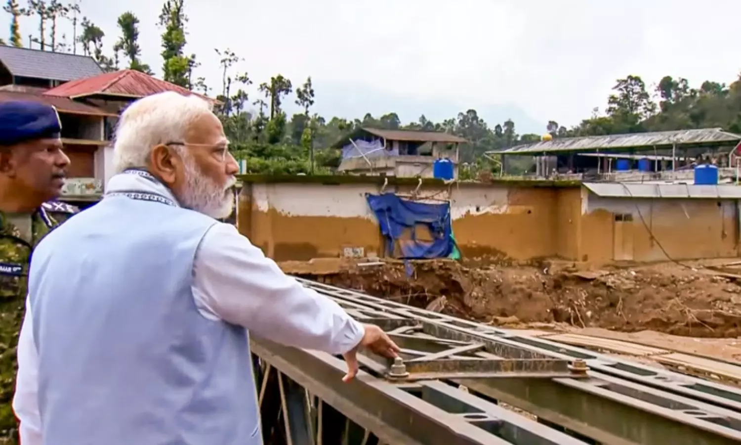 Thereafter, he landed at the SKMJ Higher Secondary School in Kalpetta here and then travelled by road to Chooralmala, where a 190-foot-long Bailey bridge had been built by the army after the disaster.