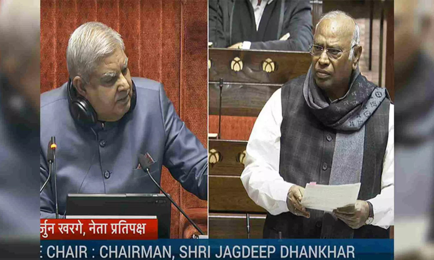 Rajya Sabha Chairman Jagdeep Dhankhar and Leader of Opposition Mallikarjun Kharge (Photo/Sansad TV)