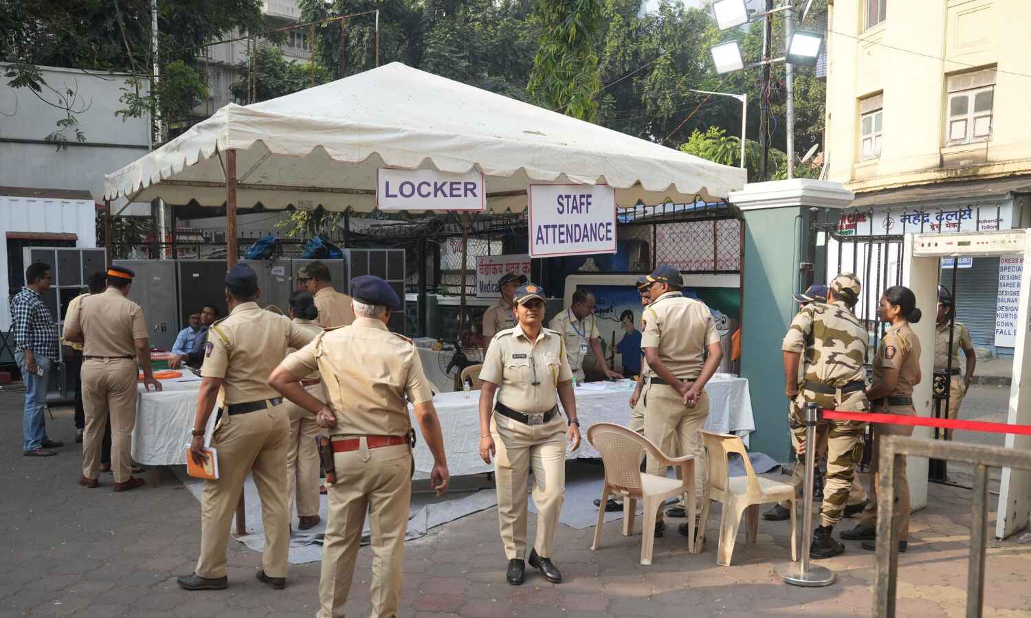 Police and security personnel stand guard a barricaded road near a counting center amid the counting of votes for the Maharashtra Assembly elections (PTI)