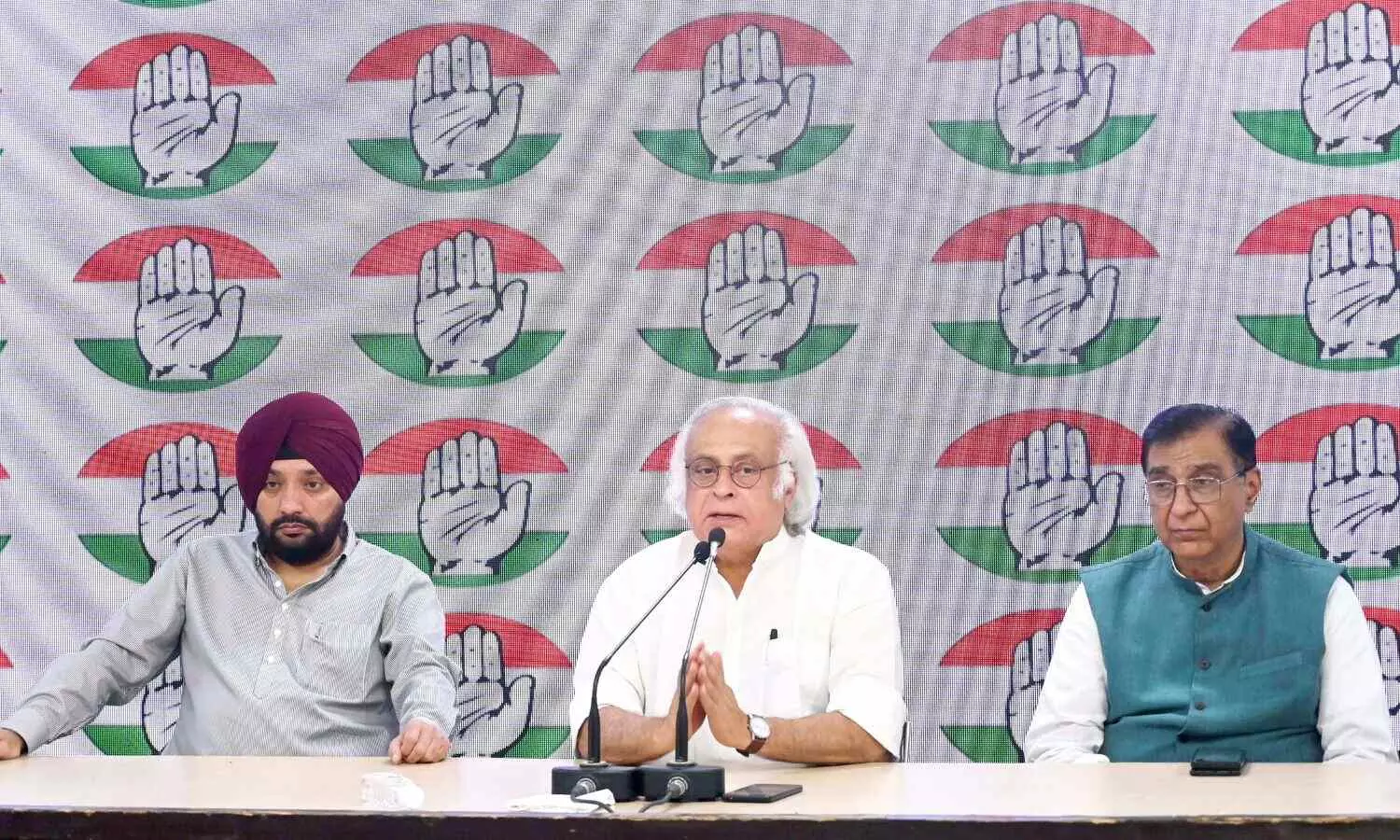 Congress leaders Jairam Ramesh, Arvinder Singh Lovely and Deepak Babaria during a press conference (PTI)
