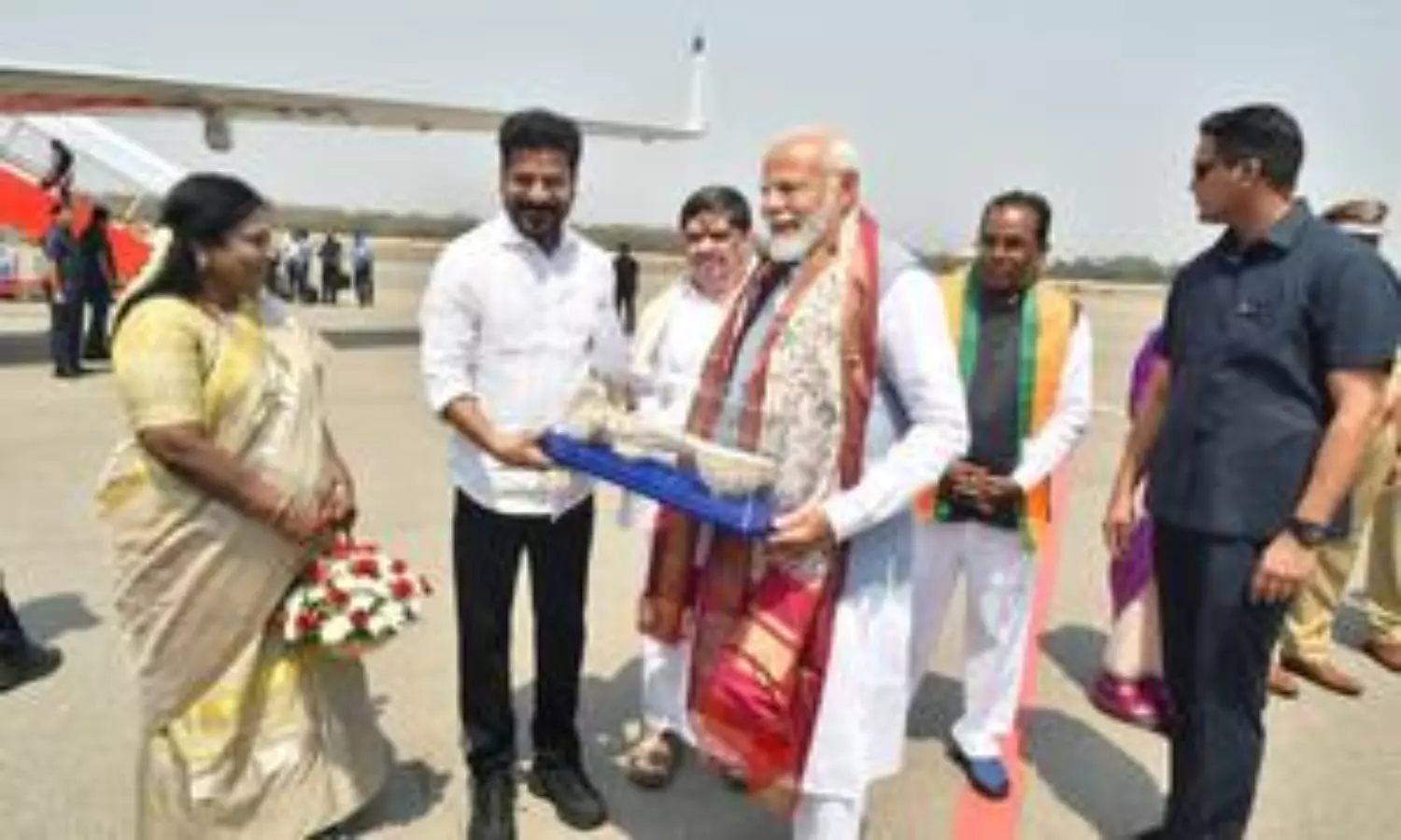 Revanth Reddy along with Governor Tamilisai Soundararajan gave a warm send-off to the Prime Minister at Begumpet Airport on his return after a two-day visit to the state.