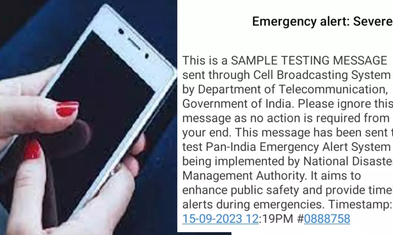 "This is a SAMPLE TESTING MESSAGE sent through the Cell Broadcasting System by the Department of Telecommunication, Government of India. Please ignore this message as no action is required from your end. This message has been sent to test the Pan-India Emergency Alert System being implemented by the National Disaster Management Authority. It aims to enhance public safety and provide timely alerts during emergencies," the text message read. The message was sent in both Hindi and English to cell phones of people across India and upon receipt, cell phones started vibrating with a sharp beep sound, alerting people.