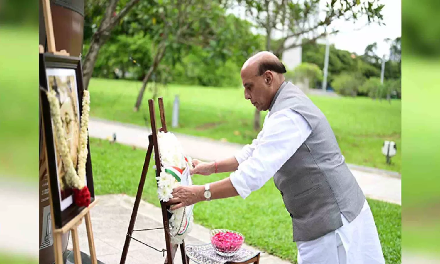 SINGAPORE: Union Defence Minister Rajnath Singh paid a visit to Singapore on Saturday, on his way back home from Indonesia. In Singapore, the Defence Minister paid his tributes to Netaji Subhas Chandra Bose by laying a wreath at the Indian National Army (INA) marker there.
