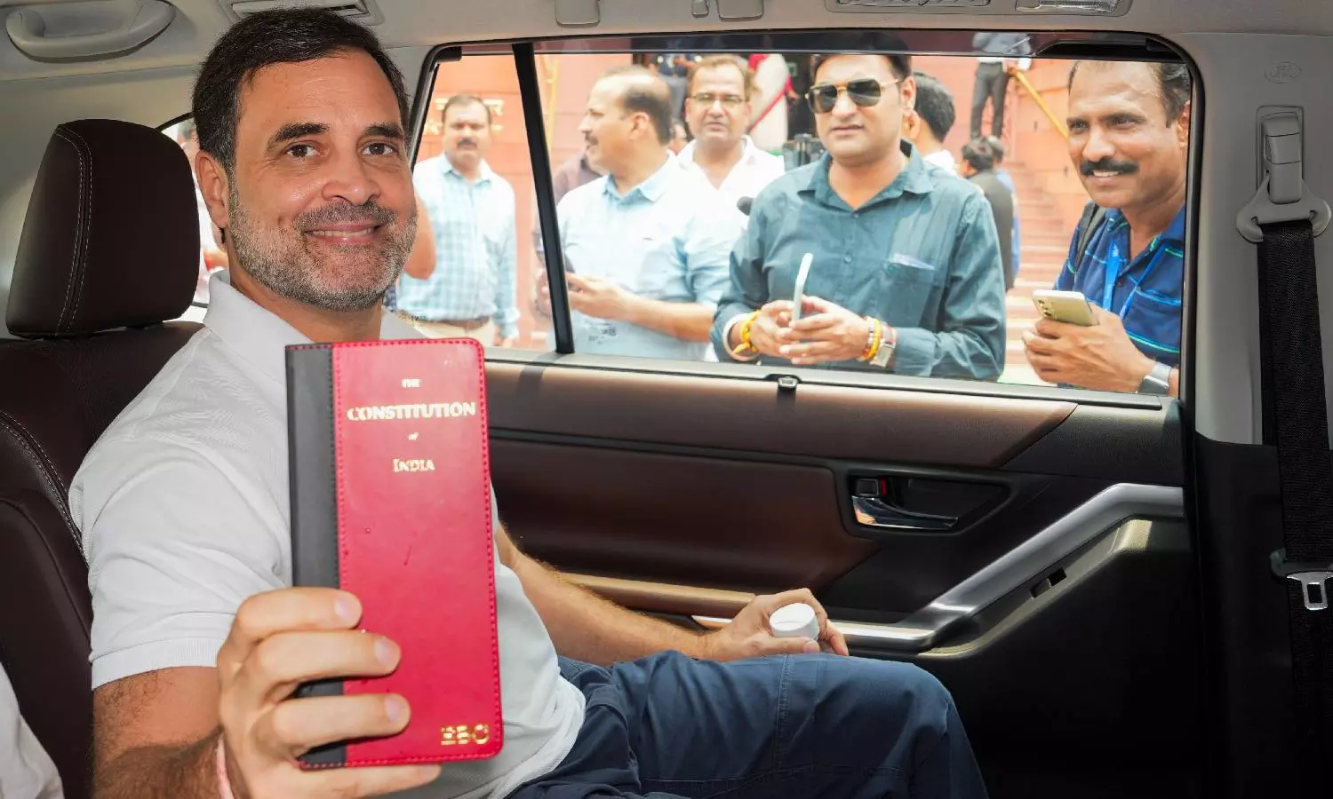 Congress member Rahul Gandhi shows a book of Constitution of India at the Parliament House complex (PTI)
