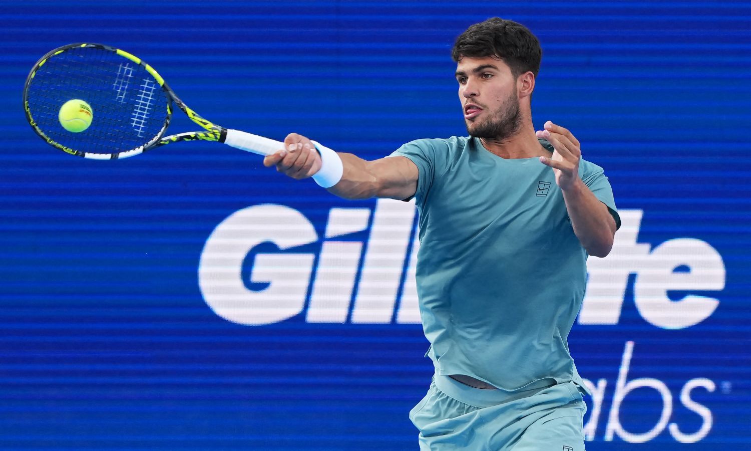 Carlos Alcaraz plays a forehand shot against Alexander Zverev