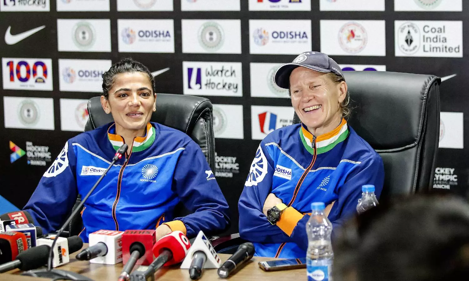 Savita Punia and coach Janneke Schopman during press conference ahead of the clash against Germany