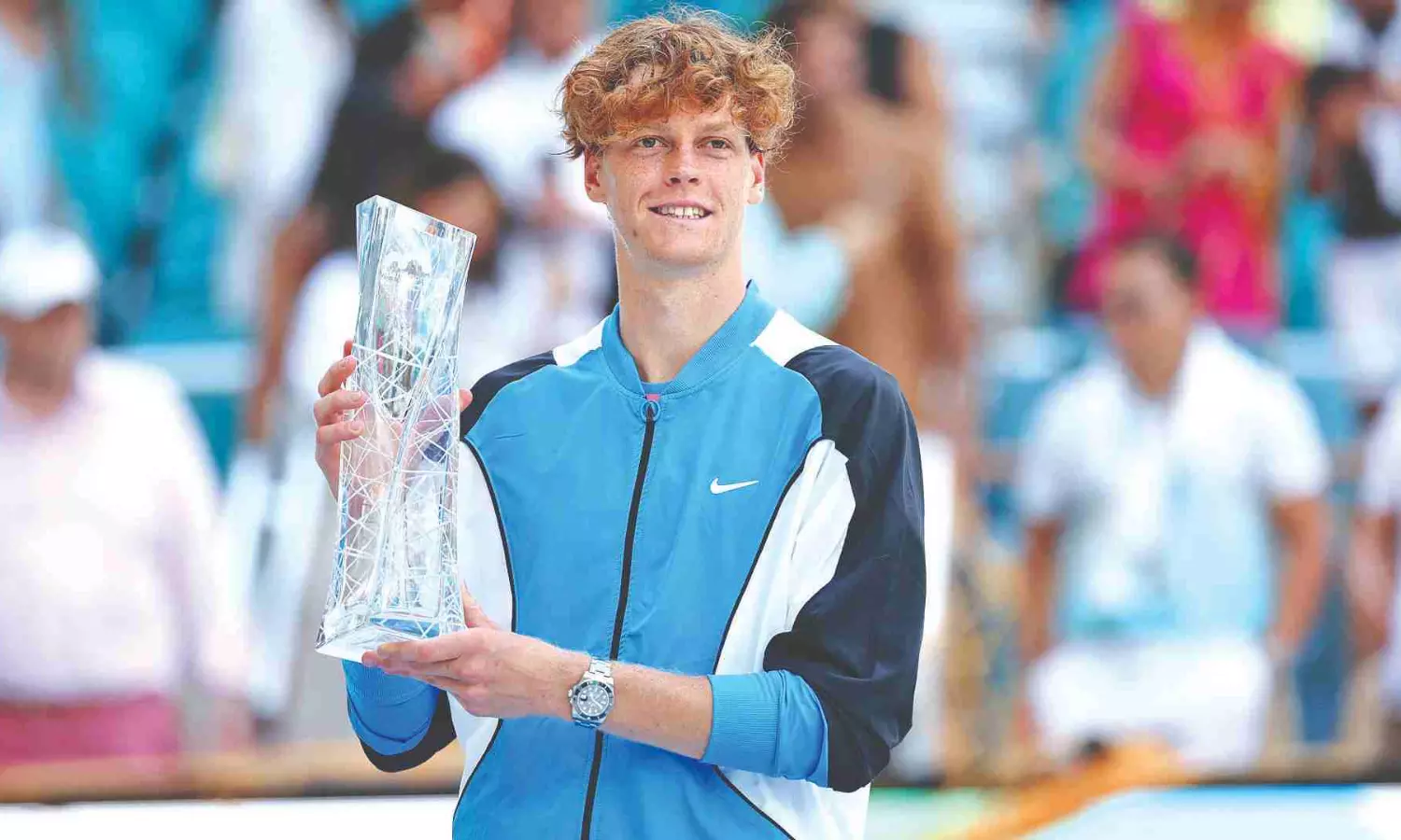 Jannik Sinner poses with the Jannik Sinner Miami Open trophy