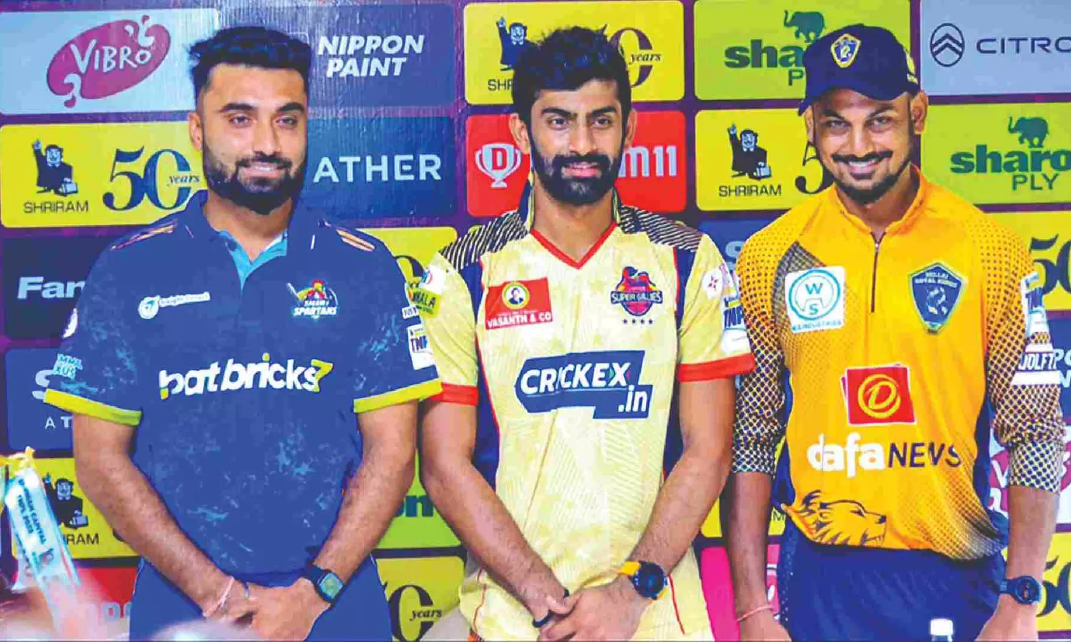 (from left) Salem Spartans captain Abhishek Tanwar, Chepauk Super Gillies skipper Narayan Jagadeesan and Nellai Royal Kings skipper KB Arun Karthick at the pre-tournament press conference in Coimbatore
