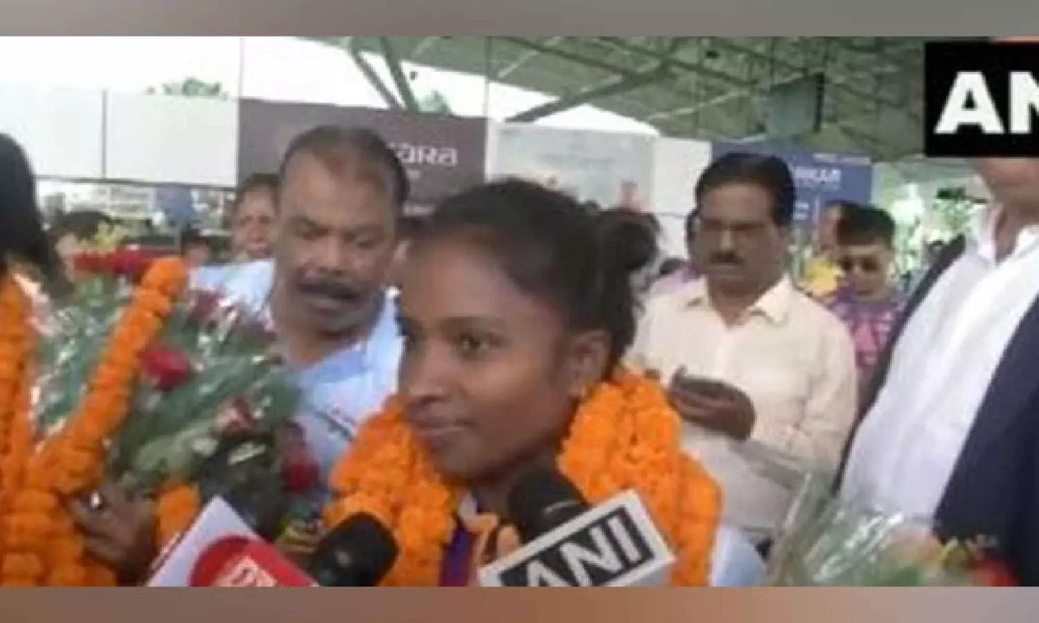 Hockey Player Nikki Pradhan at Ranchi Airport (Image: ANI)