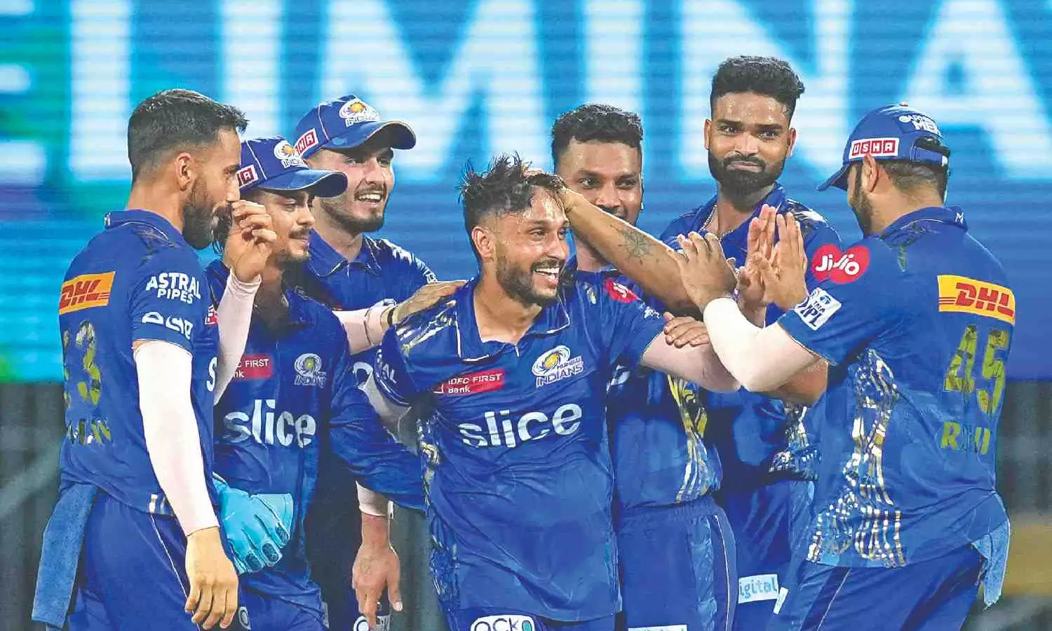 Akash Madhwal (centre) rose to the occasion on Wednesday taking five wickets against LSG.