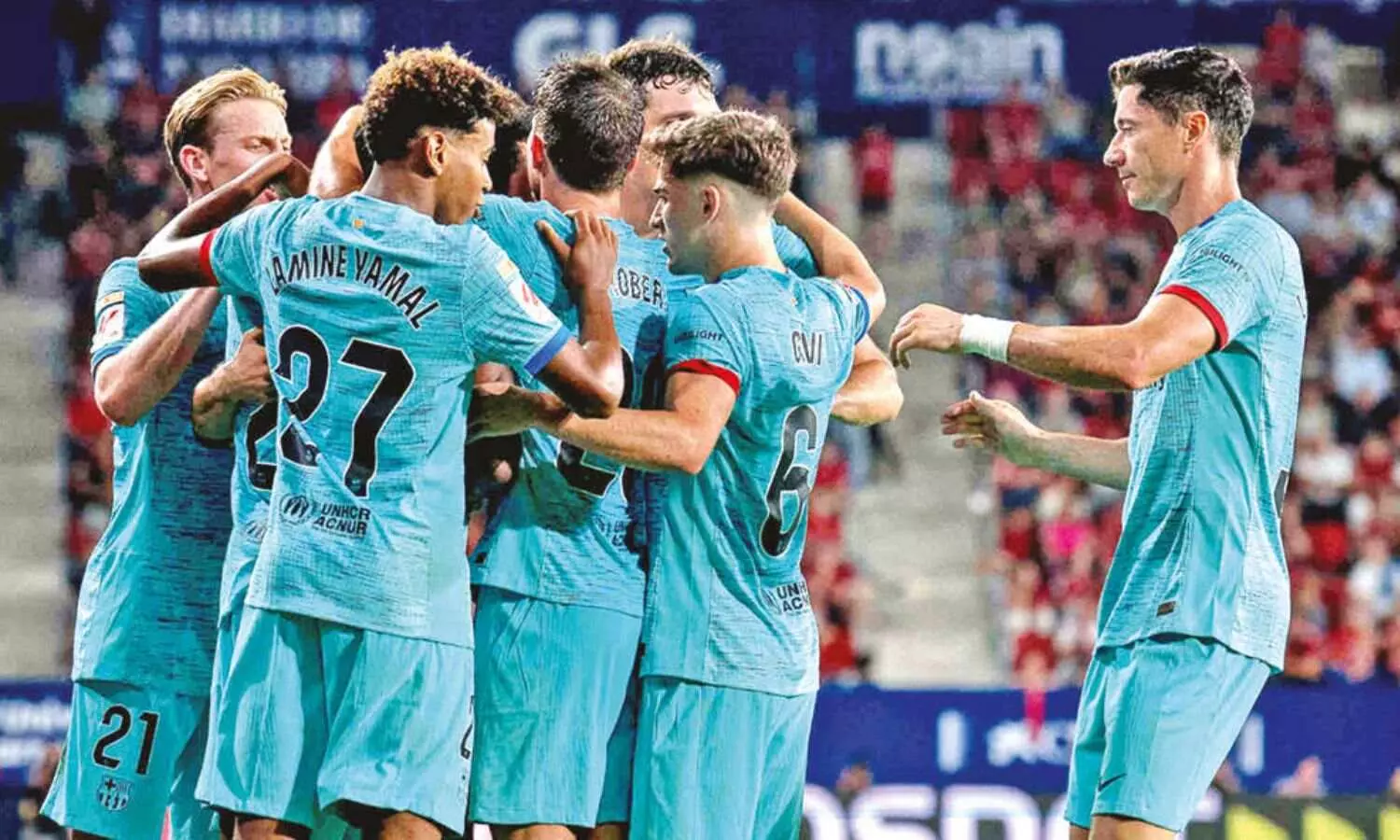 Barcelona players celebrate a goal against Osasuna FC