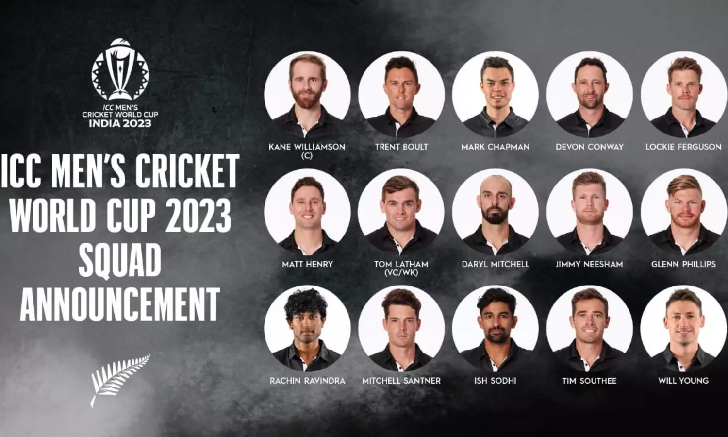 Squad: Kane Williamson (c), Trent Boult, Mark Chapman*, Devon Conway*, Lockie Ferguson, Matt Henry, Tom Latham (vc,wk), Daryl Mitchell*, Jimmy Neesham, Glenn Phillips*, Rachin Ravindra*, Mitchell Santner, Ish Sodhi, Tim Southee, Will Young* (*First One Day Cricket World Cup selection)