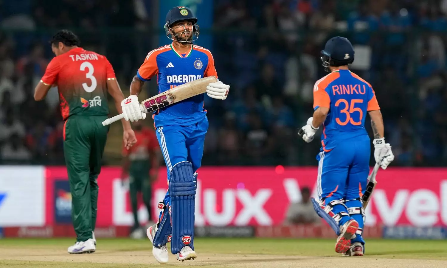 India's Nitish Kumar Reddy and Rinku Singh run between the wickets during the second T20 International cricket match between India and Bangladesh at the Arun Jaitley Stadium (PTI)