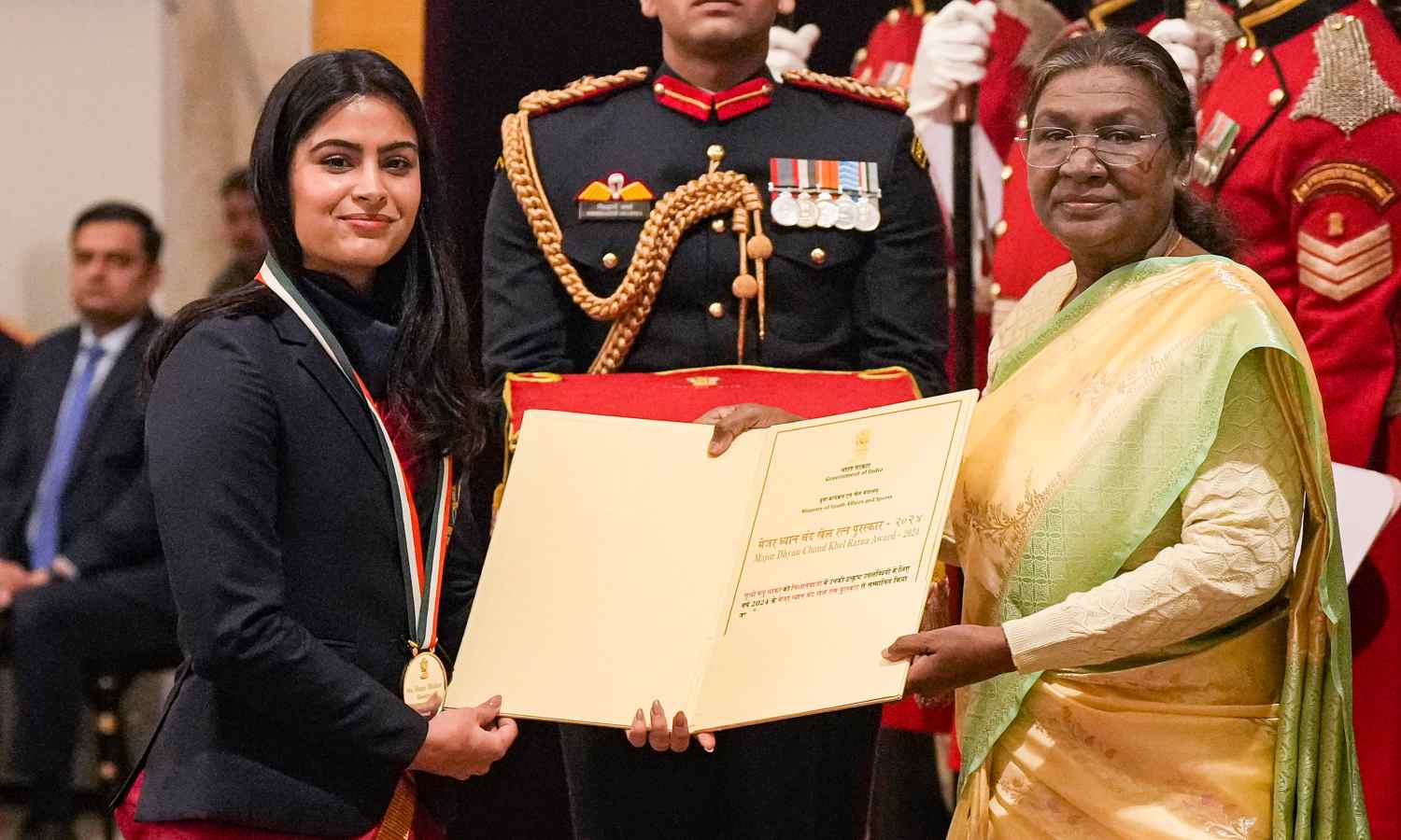 Double Olympic-medallist Bhaker, 18-year-old chess world champion Gukesh, men's hockey captain Harmanpreet Singh and Paralympic gold-winning high jumper Praveen Kumar were presented the country's highest sporting honour -- the Major Dhyan Chand Khel Ratna.