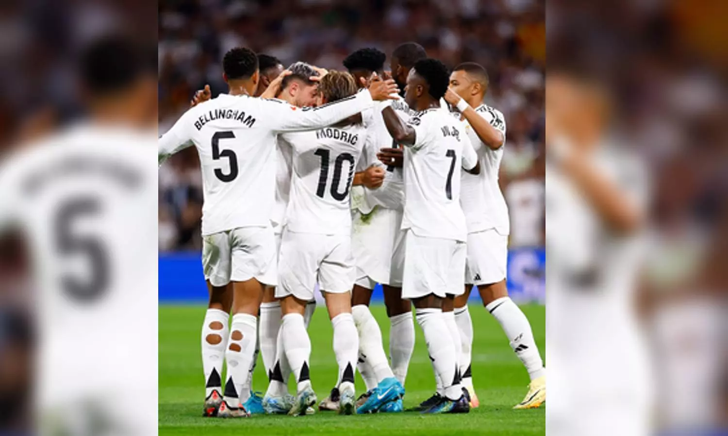 Real Madrid players celebrate after scoring a goal (IANS)