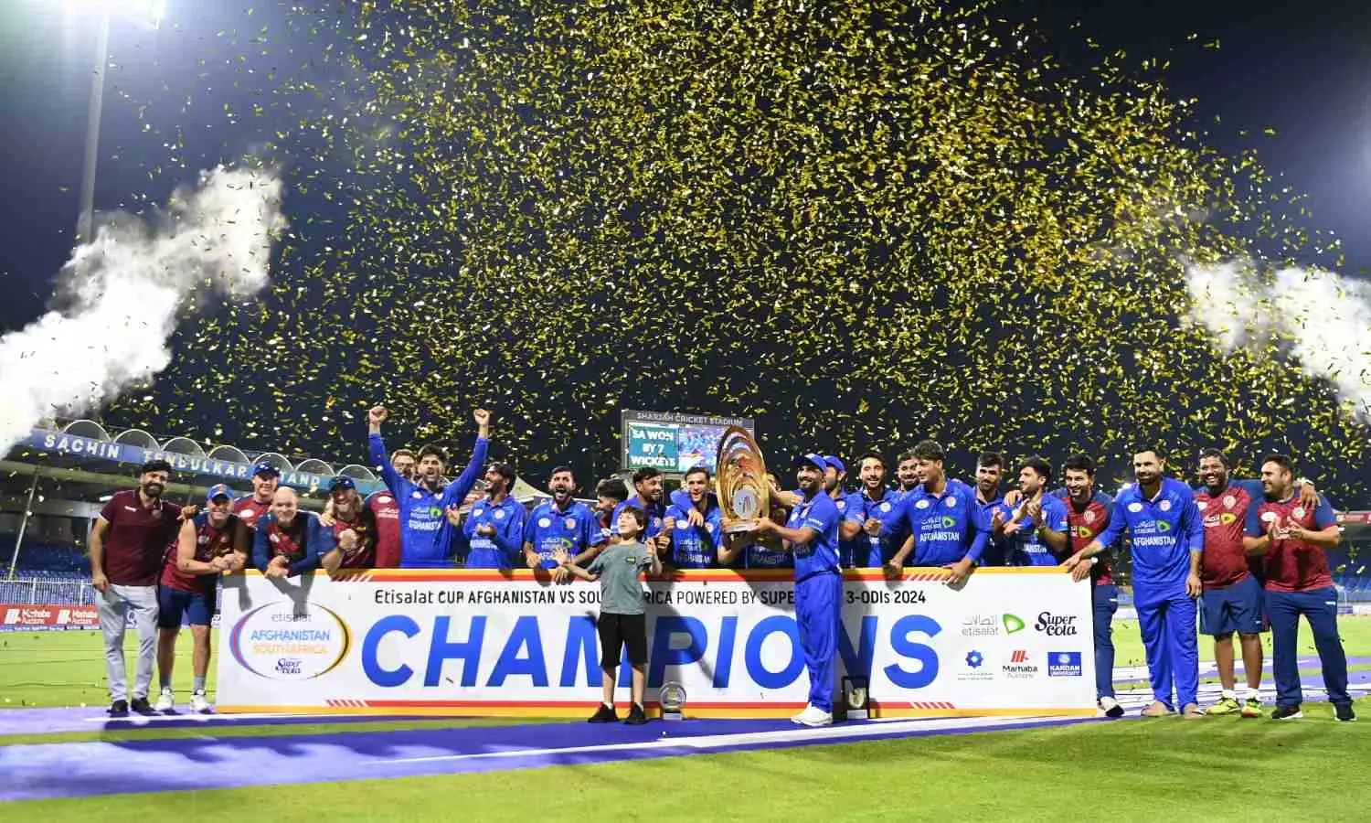 Afghanistan players pose with the trophy after ODI series triumph against South Africa (X/ACBofficials)