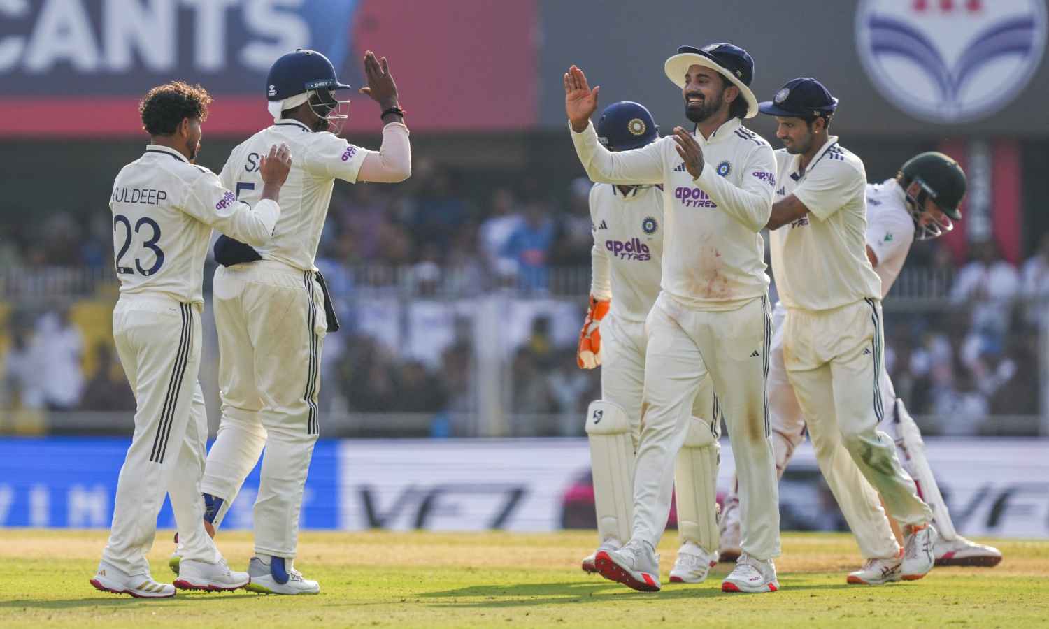 India's Kuldeep Yadav celebrates with teammates after taking the wicket of South Africa's Tristan Stubbs during the first day of the second Test cricket match between India and South Africa, at ACA Stadium, Barsapara in Guwahati, Saturday, Nov. 22, 2025 (PTI)