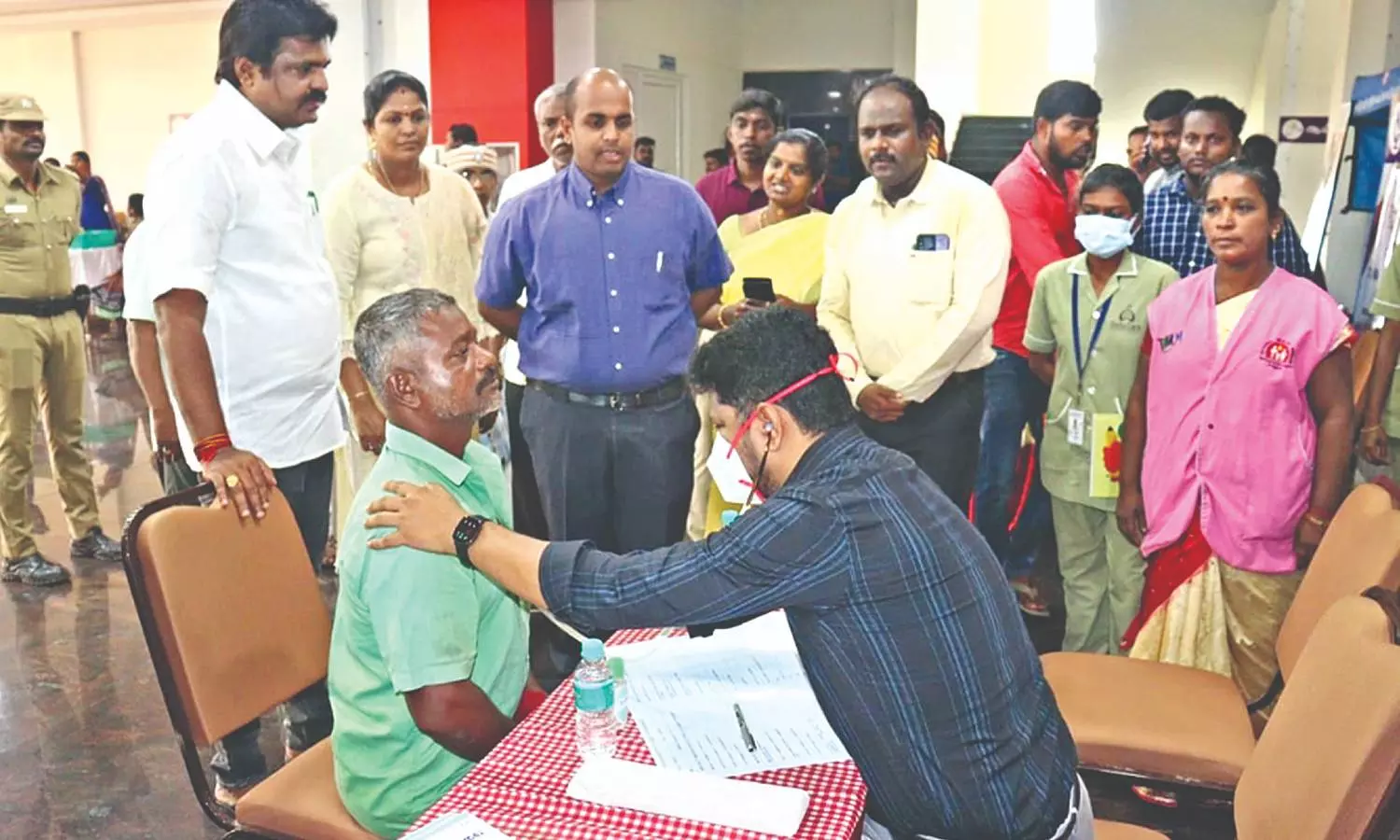 Cleanliness staff being checked at medical camp in Thanjavur
