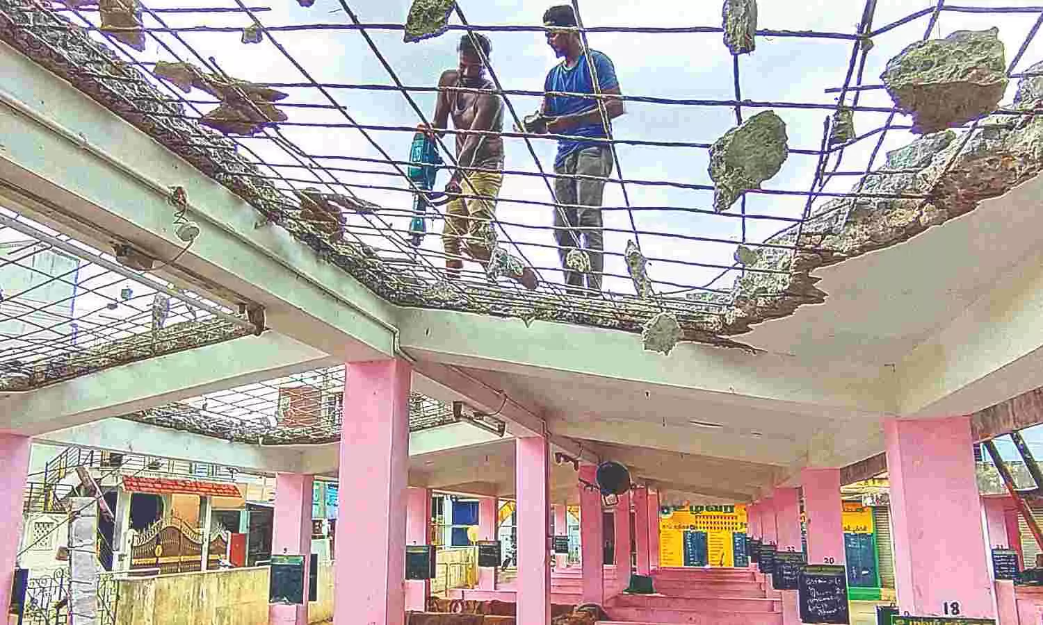 Renovation works under way at the Uzhavar Sandhai in Kagithapattarai, Vellore