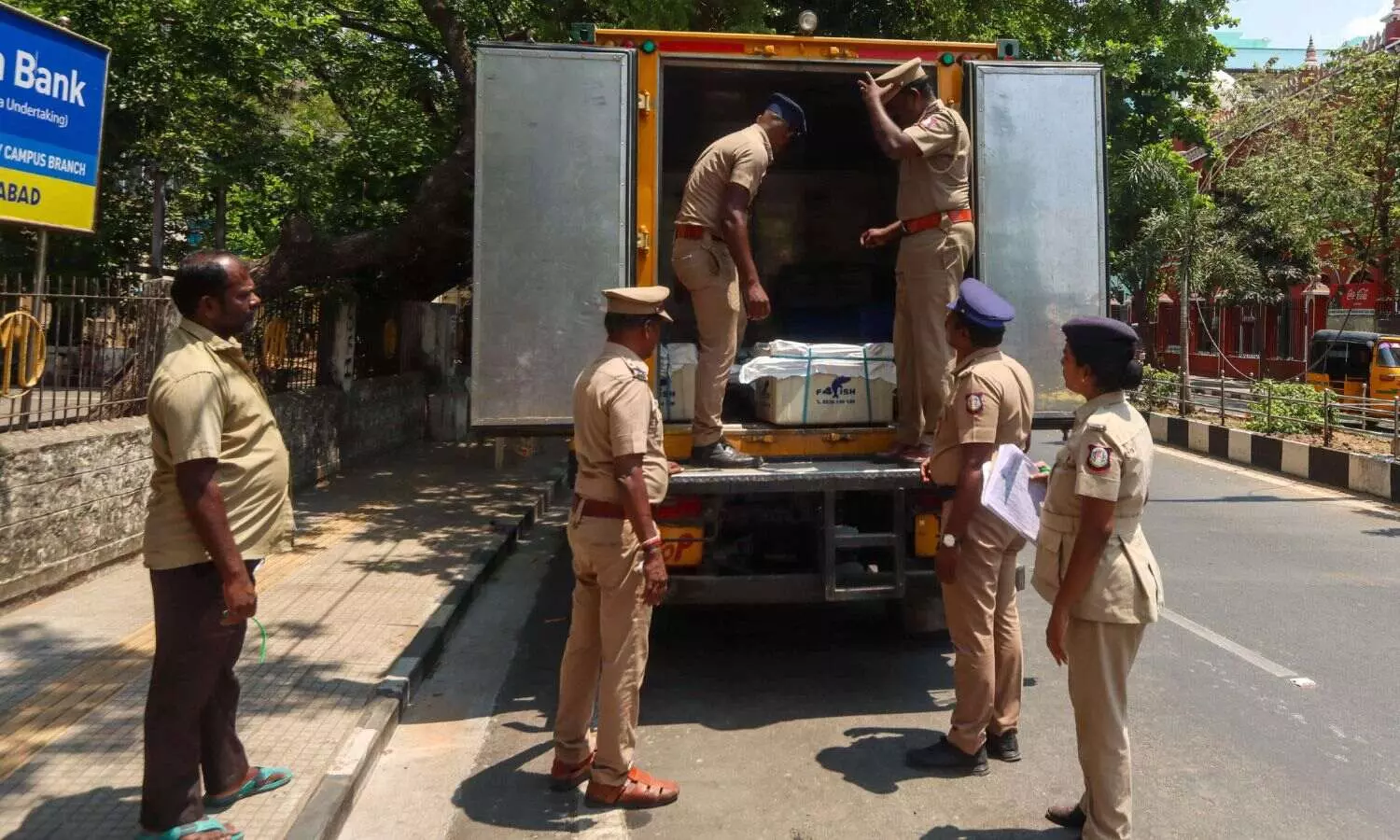 Flying squad members checking a vehicle to prevent misuse of money power and bribing of voters in Chennai on Sunday (Photo: Hemanathan M)
