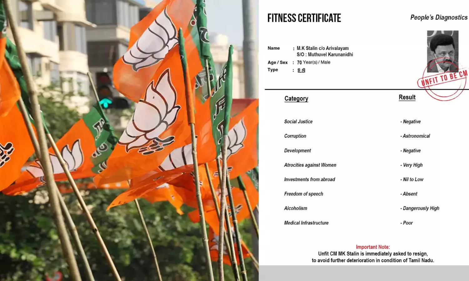 The image also has a note stating, ' Unfit CM MK Stalin is immediately asked to resign, to avoid further deterioration in condition of Tamil Nadu'
