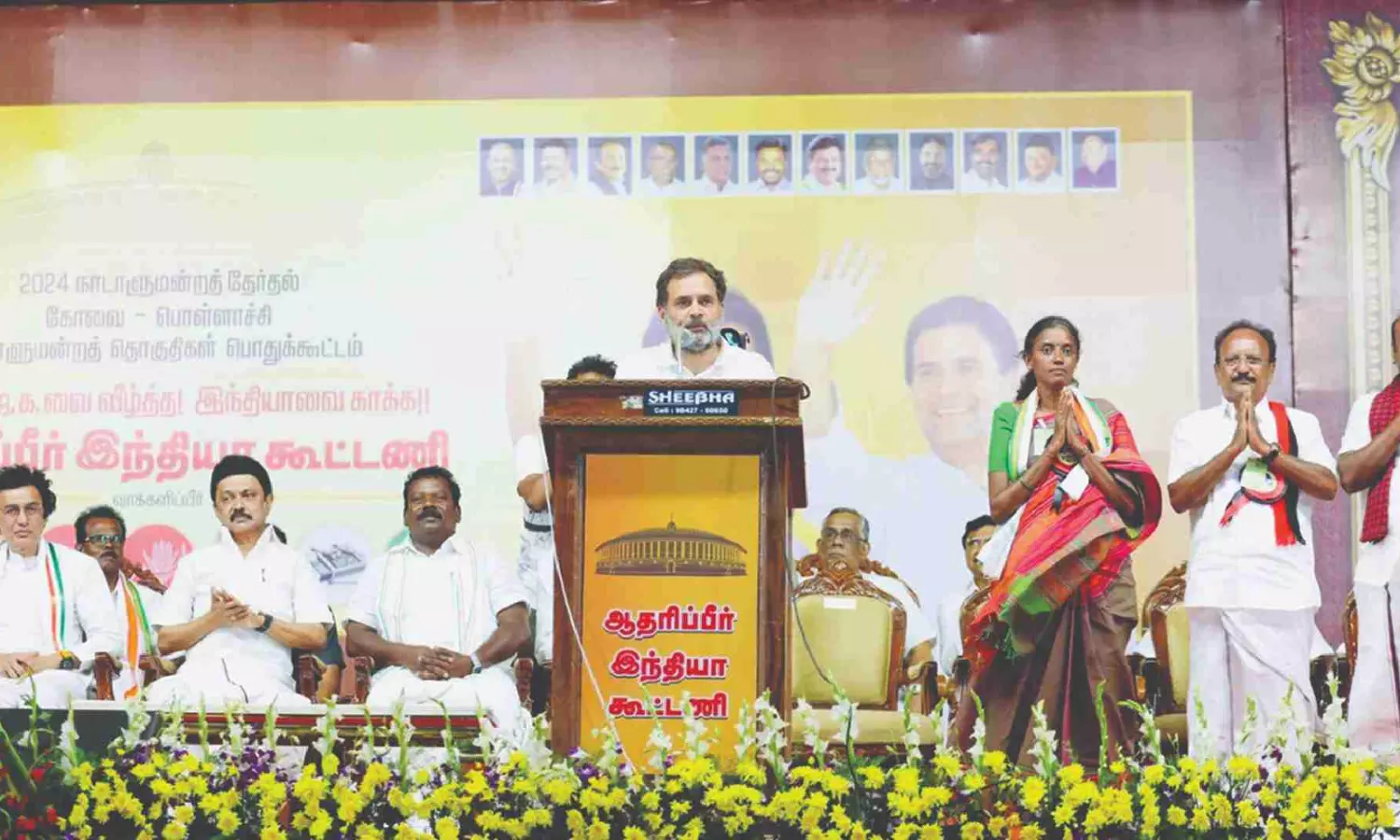 Congress leader Rahul Gandhi introducing party candidates to public in the presence of Chief Minister MK Stalin in Coimbatore on Friday