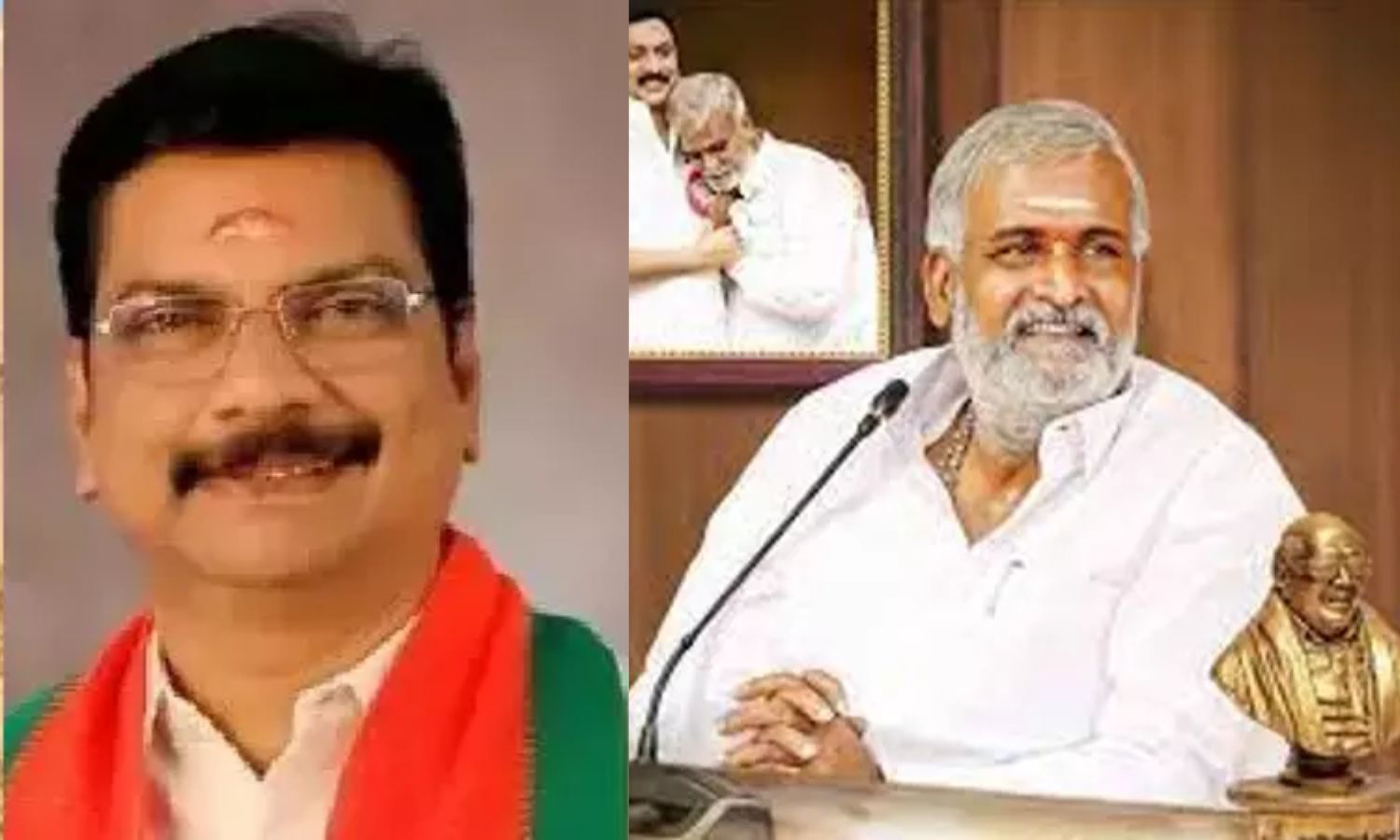 BJP state spokesperson ANS Prasad and HR&CE Minister P K Sekarbabu (L to R)