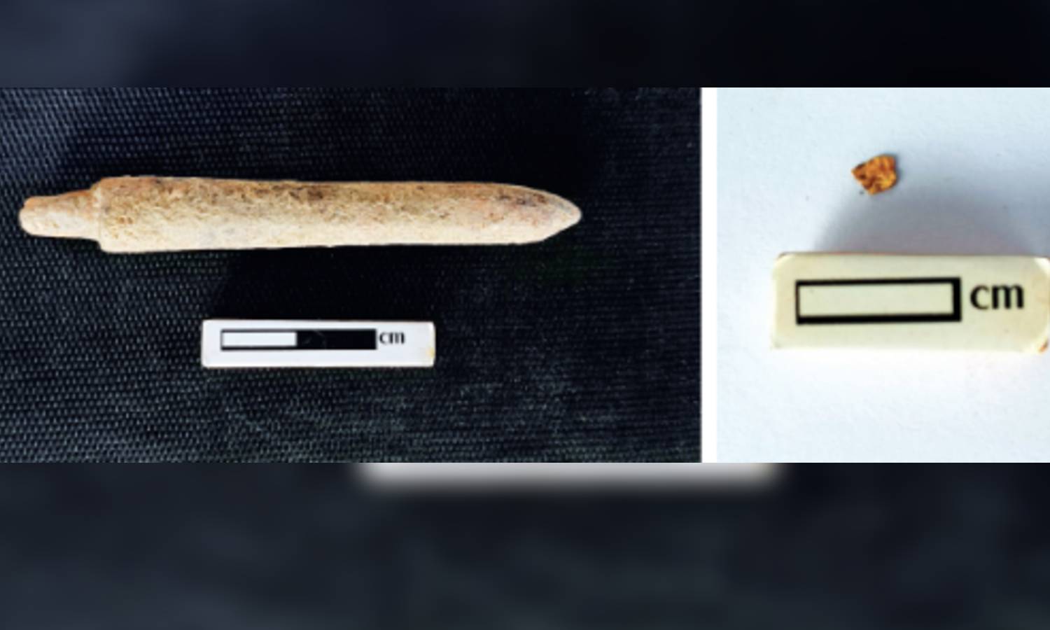 Bone point (top) and gold piece (right) found at Porpanaikottai excavation site in Pudukkottai