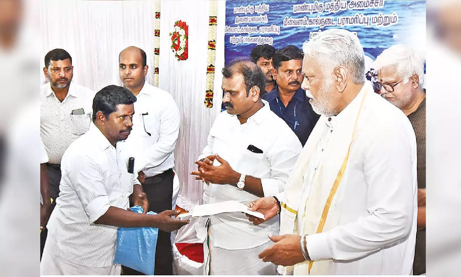Parshottan Rupala and L Murugan receive petition from fishermen in Thanjavur on Saturday