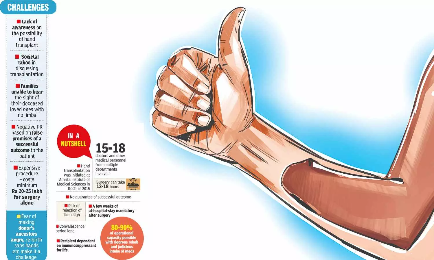 To call a hand transplant surgery complex would be a gross understatement. Over a dozen doctors from multiple specialities perform a surgery that could last upto 18 hours with no guarantees of a successful outcome. Lack of awareness on the possibility of viable limbs post-surgery, cost of procedure and a long period of recovery and rehab are some of the reasons for the limited number of hand transplants in the State.