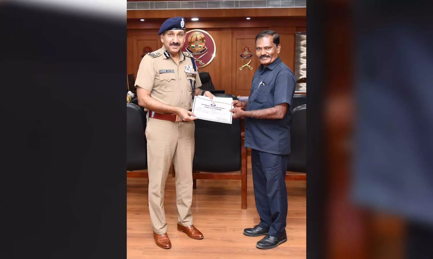 CHENNAI: The Commissioner of Police, Sandeep Rai Rathore, personally called on Apollindas and gave a reward and certificate for handing over Rs 18,000 honestly in the KK Nagar police station, which was found in a bank ATM centre.