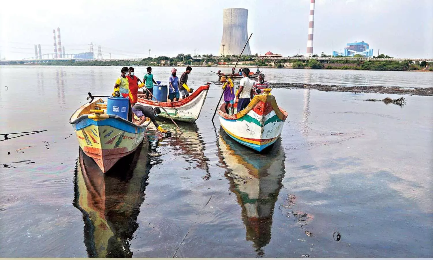 CHENNAI: Forced away from their traditional occupation for more than 20 days due to incessant rains, flooding and crude oil spillage, fishermen in Ennore have taken up gigs to clean the oil from Kosasthalaiyar River for a meagre Rs 750 per day, with nothing but jugs to clean-up.