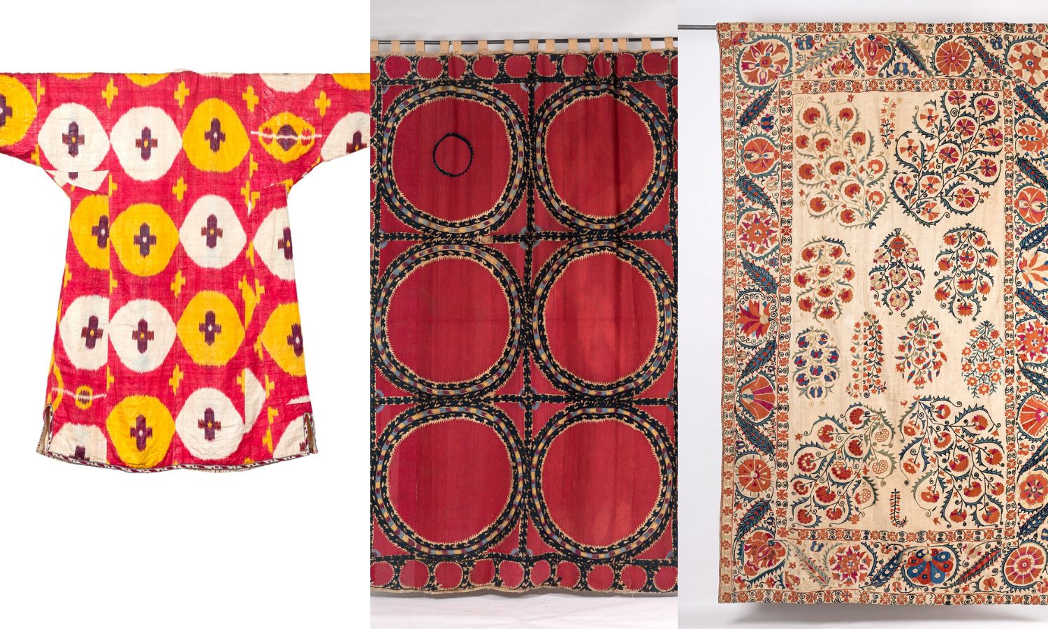 L to R: Chapan Ikat, Suzani from Tashkent, one of David's favourite pieces, Suzani embroidery,