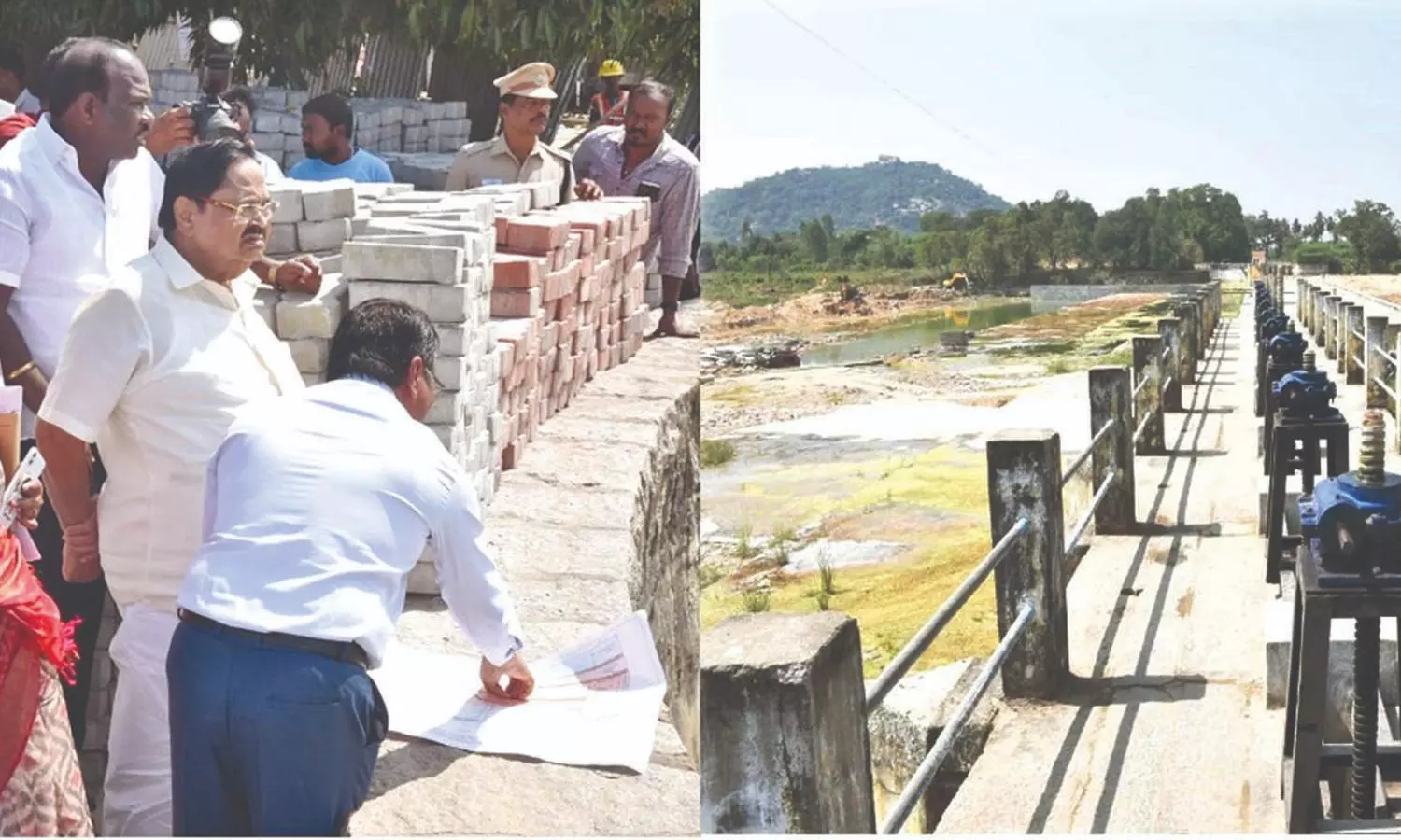 Minister Duraimurugan inspecting works on a bridge across Ponnai in Katpadi