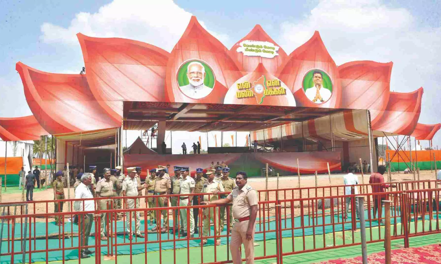The venue for Prime Minister Modi’s public meeting getting ready at Palladam in Tirupur district, on Monday