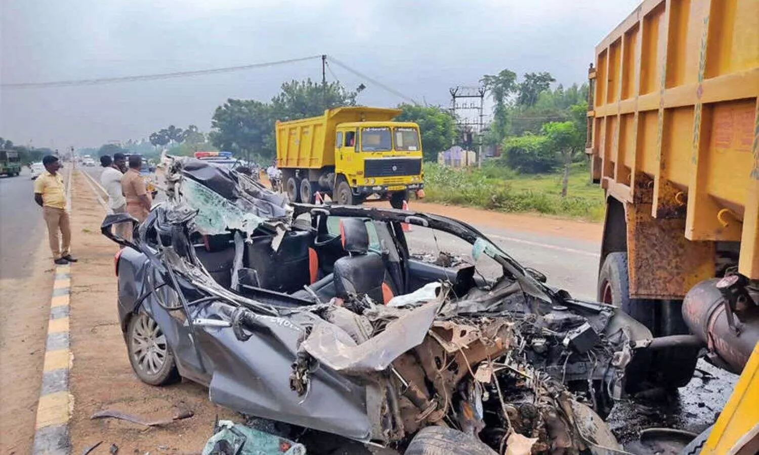 Mangled remains of car at Sengipatti in Thanjavur-Tiruchy bypass on Friday