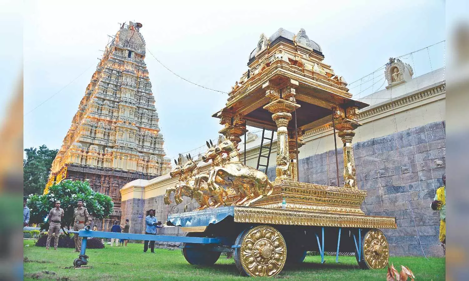 The gold-plated chariot worth Rs 5 crore donated to the Jalakandeswarar Temple left in the open in Vellore.