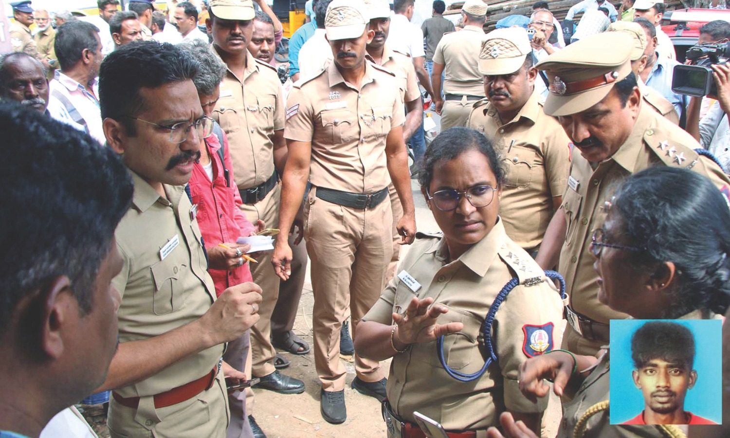 Police conduct an inquiry at the murder site; (inset) Madhan Kumar