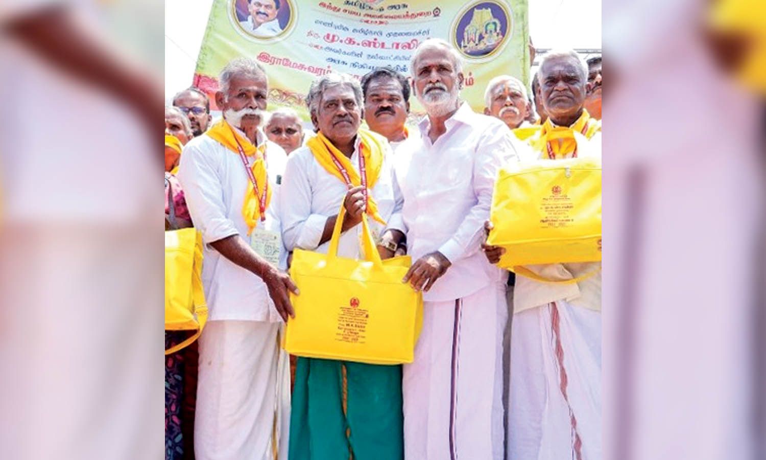 HR&CE Minister PK Sekarbabu handing over travel kit to devotees taking a Rameswaram to Kashi trip, on Thursday