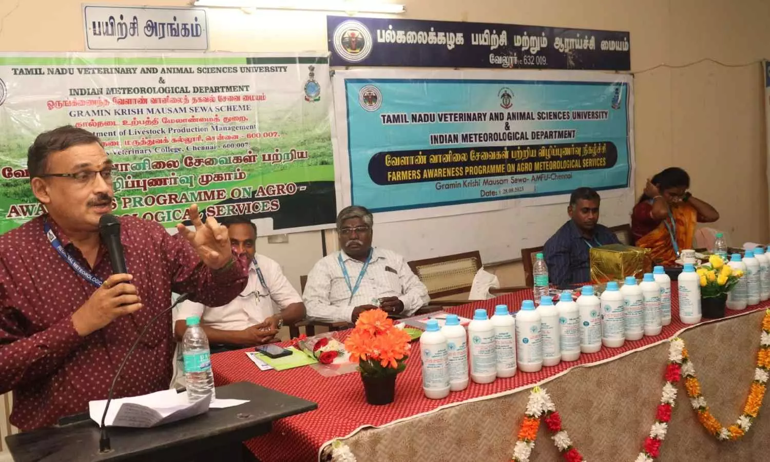 IMD’s Balachandran addressing a meeting organised by TANUVAS on agro forecasting at Vellore