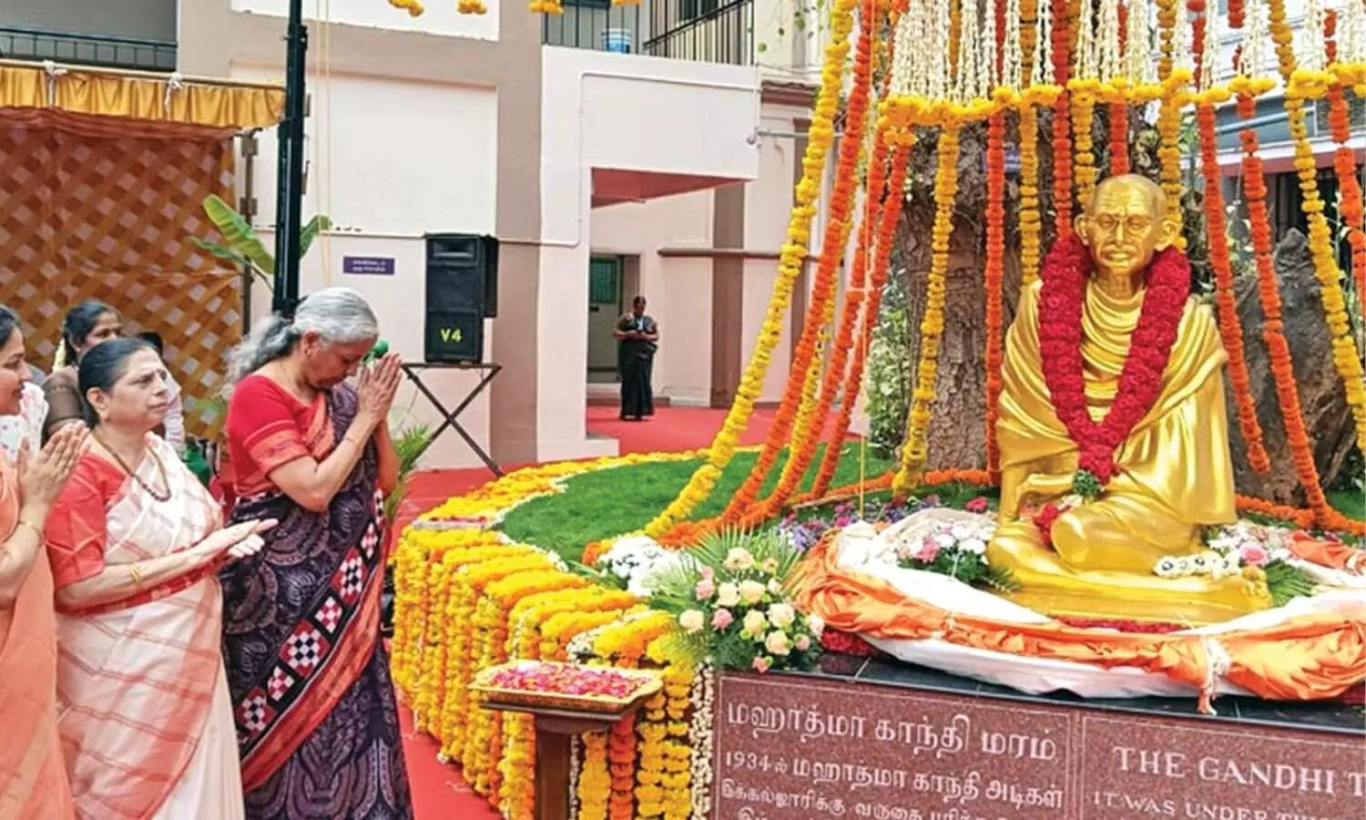 Union Finance Minister Nirmala Sitaraman unveiling a Gandhi statue in Tiruchy on Saturday