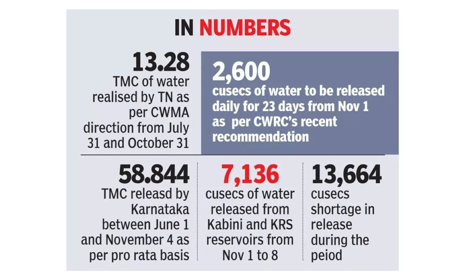 In cumulative, Tamil Nadu realised only 7,136 cusecs of water between November 1 and November 8 as against 20,800 cusecsd of water for the same period as per the direction of the CWMA’s recent order.
