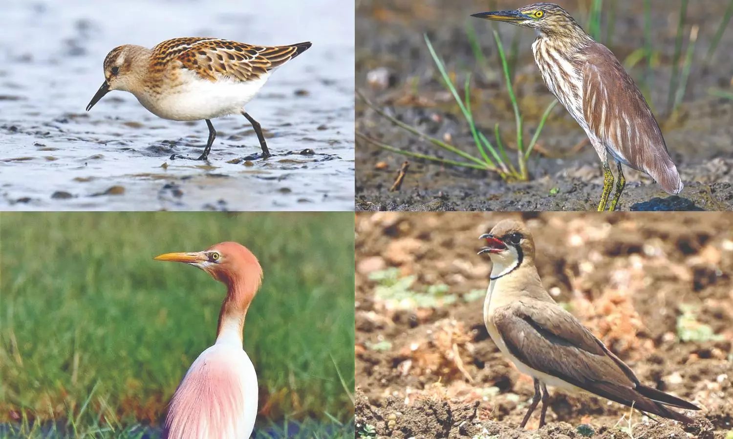 (Clockwise) Little Stint, Indian Pond Heron , Oriental Pratincole and Cattle Egret