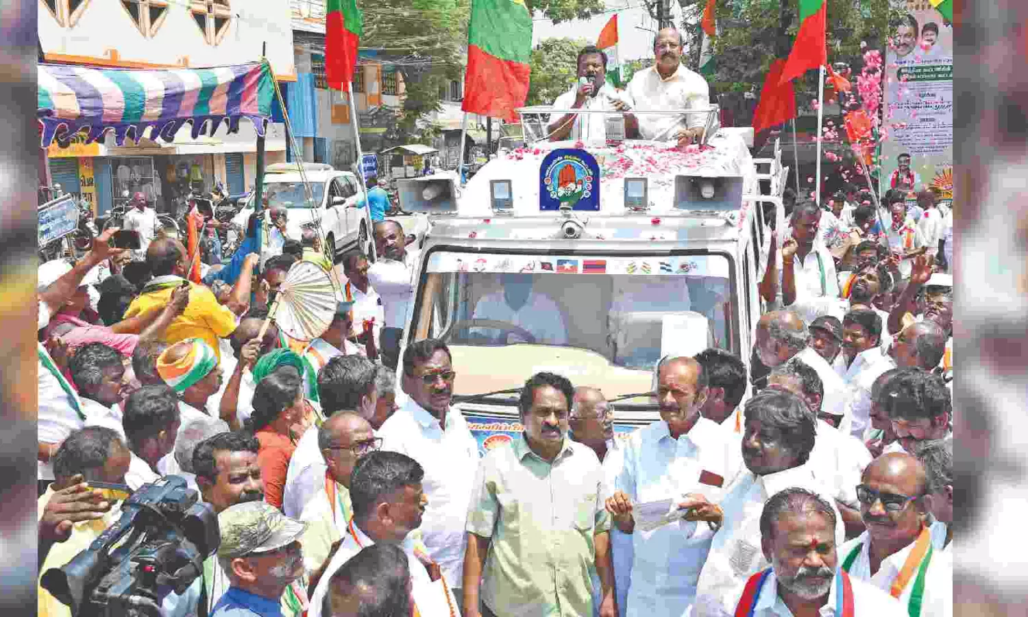 K Selvaperunthagai at an election campaign in Tiruchy on Wednesday