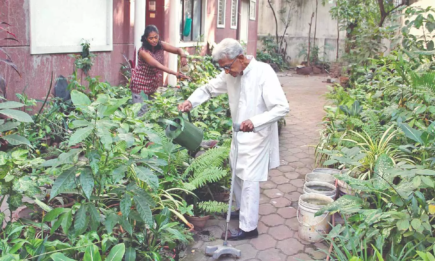 Social activist-green crusader Malini Kalyanam, and father V Kalyanam, tend to their garden (file)