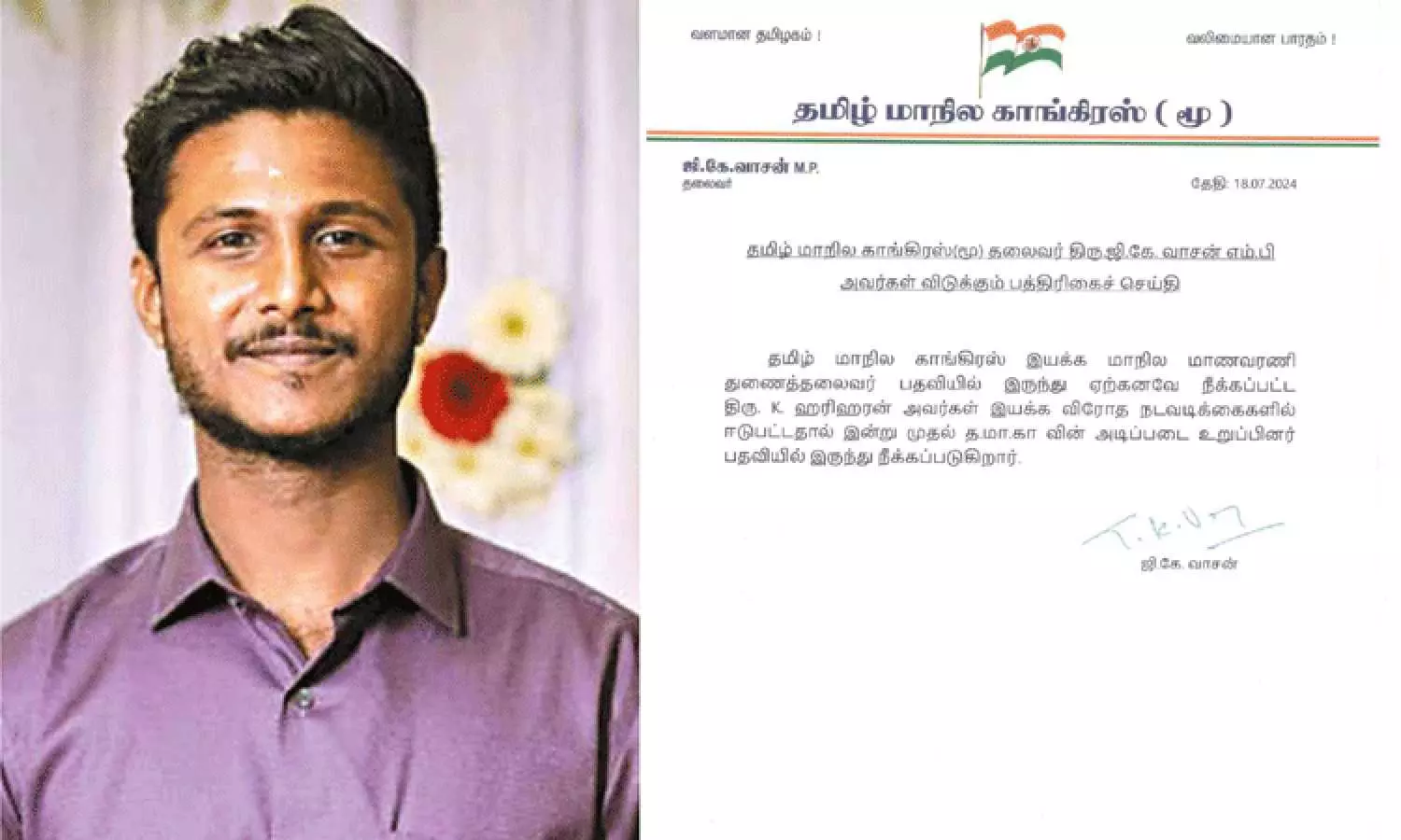 In the statement released by Tamil Maanila Congress president GK Vasan, "K Hariharan, who had already been removed from the post of Tamil Maanila Congress students wing Vice President, is now being expelled from the primary membership of the party due to his involvement in anti-party activities."