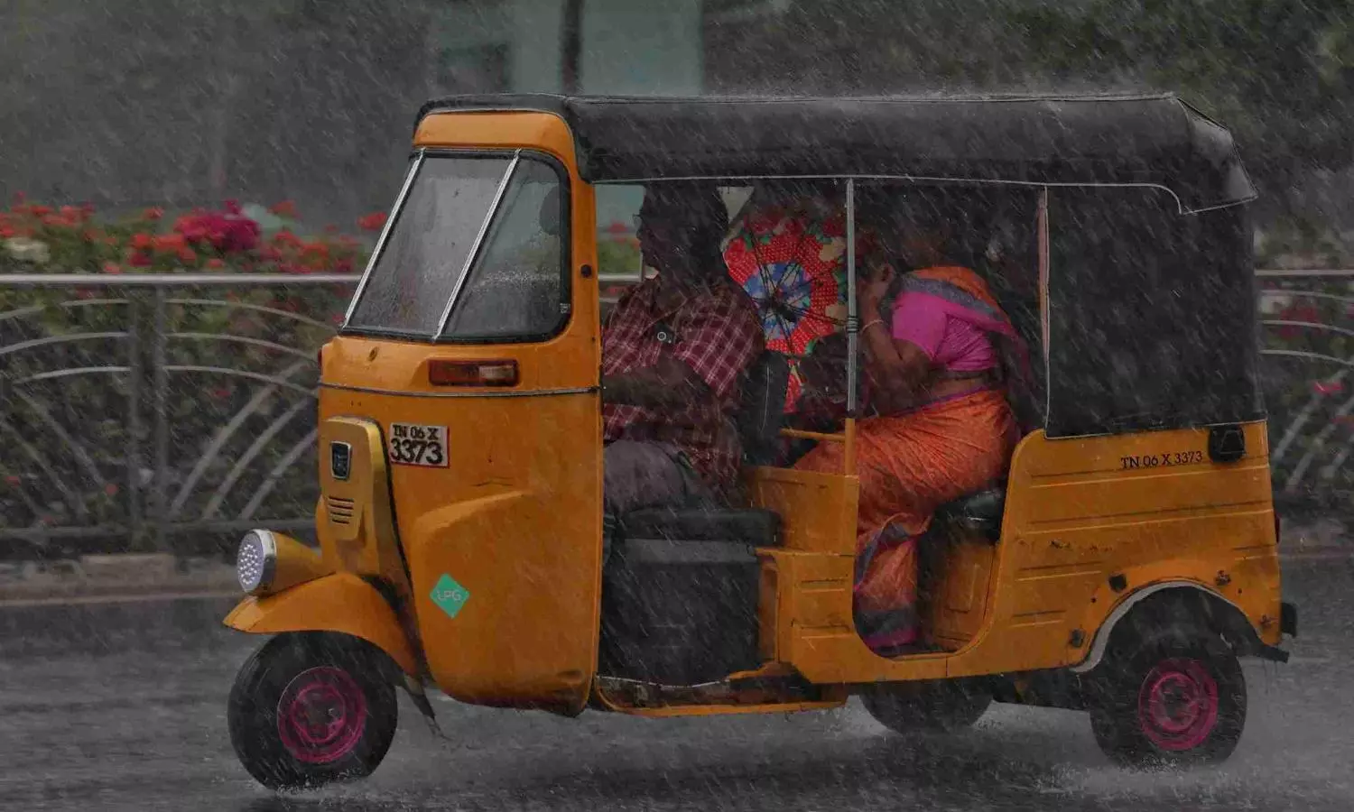 A visual of people travelling in the rains in Chennai. (Photo | Justin George/DT Next)